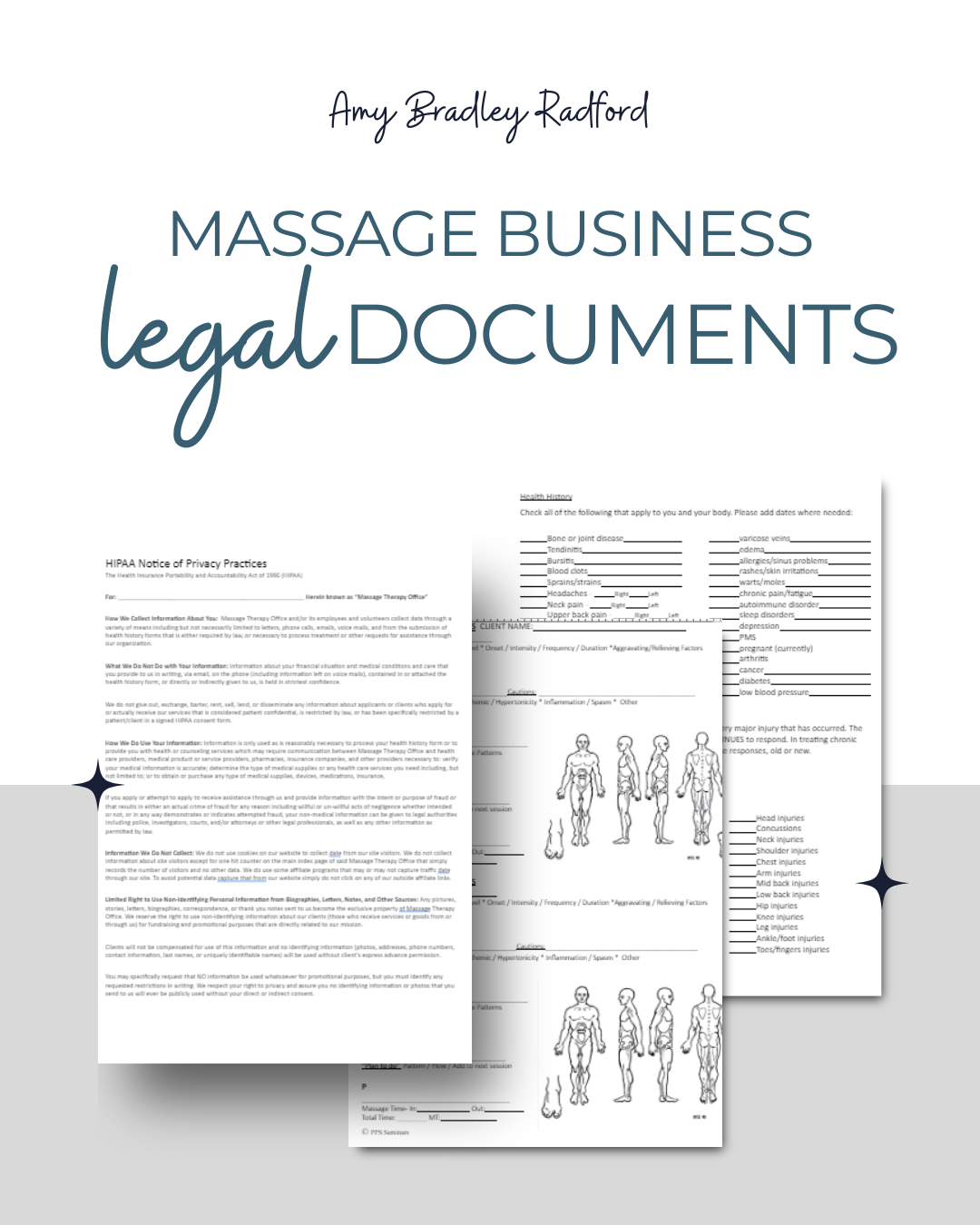 This massage therapy health history intake form includes four pages of required information for documentation of a new client and massage session(s). There is also a detailed S.O.A.P. chart to record treatment notes.